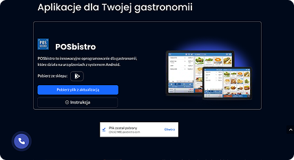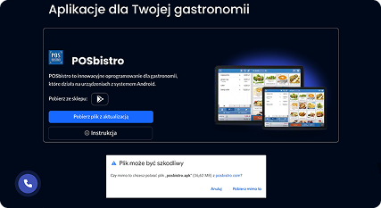 Jest to manualna metoda aktualizacji oprogramowania POSbistro, przeznaczona dla klientów, którzy nie posiadają dostępu do sklepu Google Play lub Sunmi App Store. W pliku znajduje się zawsze najnowsza wersja POSbistro. Z opcji tej mogą skorzystać również klienci, którzy chcą zaktualizować system zanim bieżąca wersja pojawi się w Sklepie Google Play.